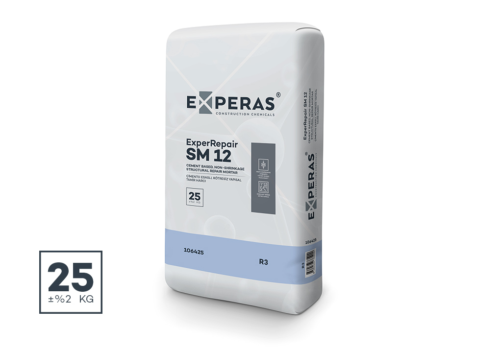 - ExperRepair SM 12 is placed in a clean mixing bowl. Then, 4,00-4,50 liters of clean water to be used for the mixture should be added to the bowl slowly and mixed with the help of a mixer (400-600 rpm) until a homogeneous and lump-free mixture is obtained.